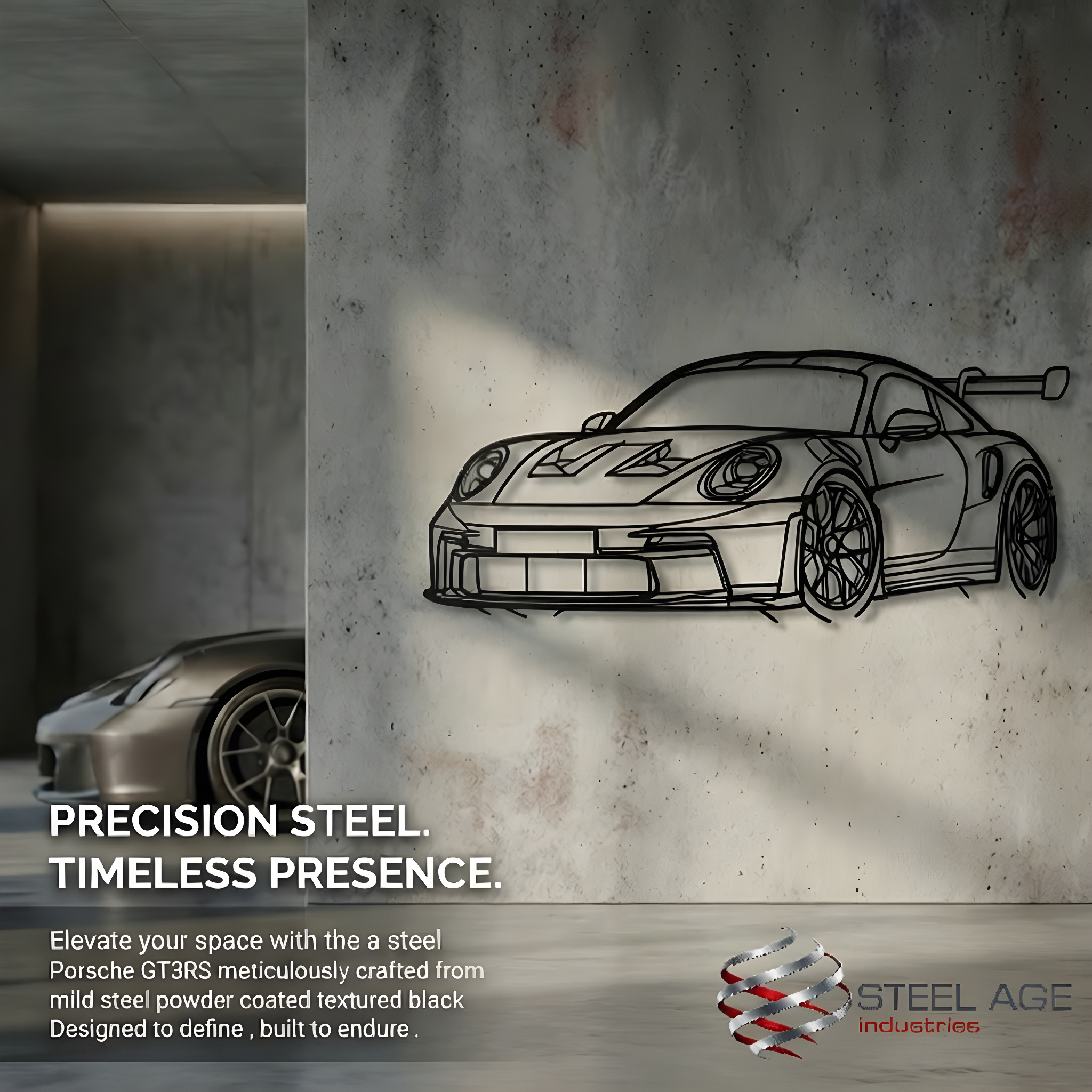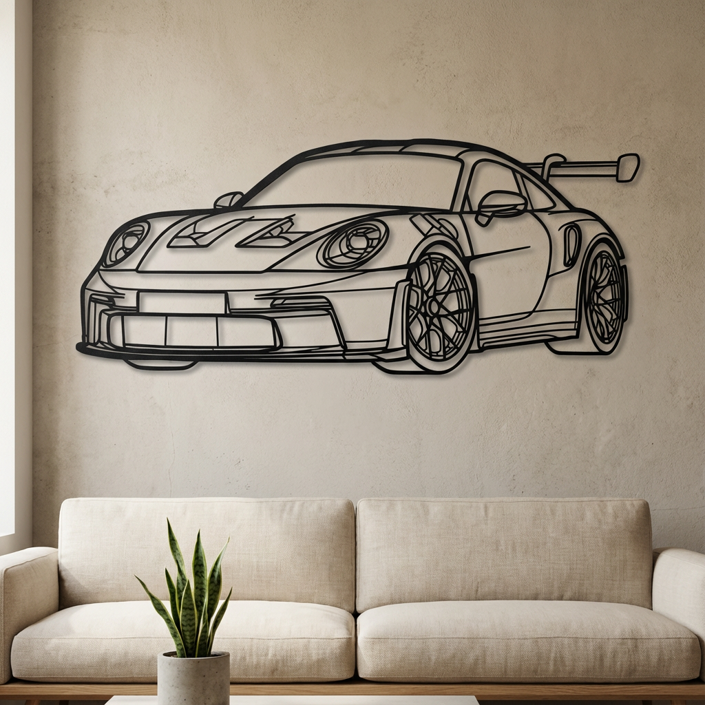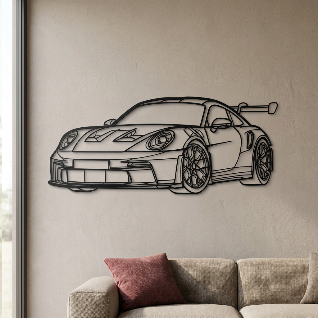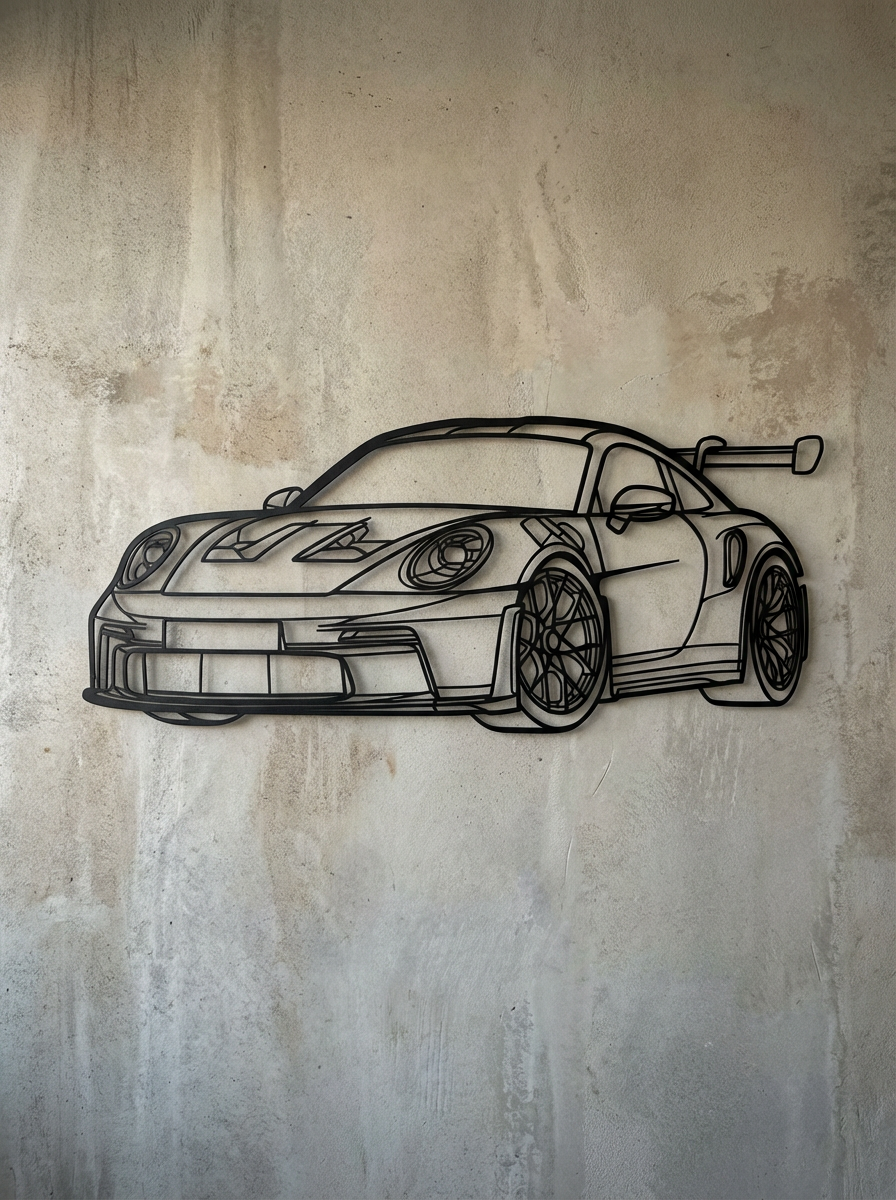 Precision-cut from high-quality mild steel and finished in a textured matte black powder coat, the Porsche GT3 RS Steel Wall Art is a bold architectural statement for automotive enthusiasts. Inspired by the iconic GT3 RS silhouette, this piece captures the performance, precision, and design language of one of Porsche’s most celebrated track-focused cars.